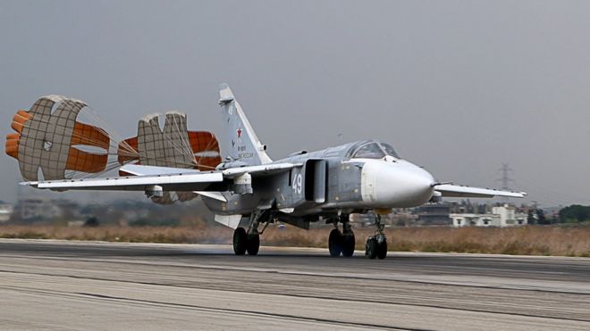 A Russian Sukhoi Su-24 bomber lands at the Russian Hmeimin military base in Latakia province, in the north-west of Syria (16 December 2015)Image copyrightAFP